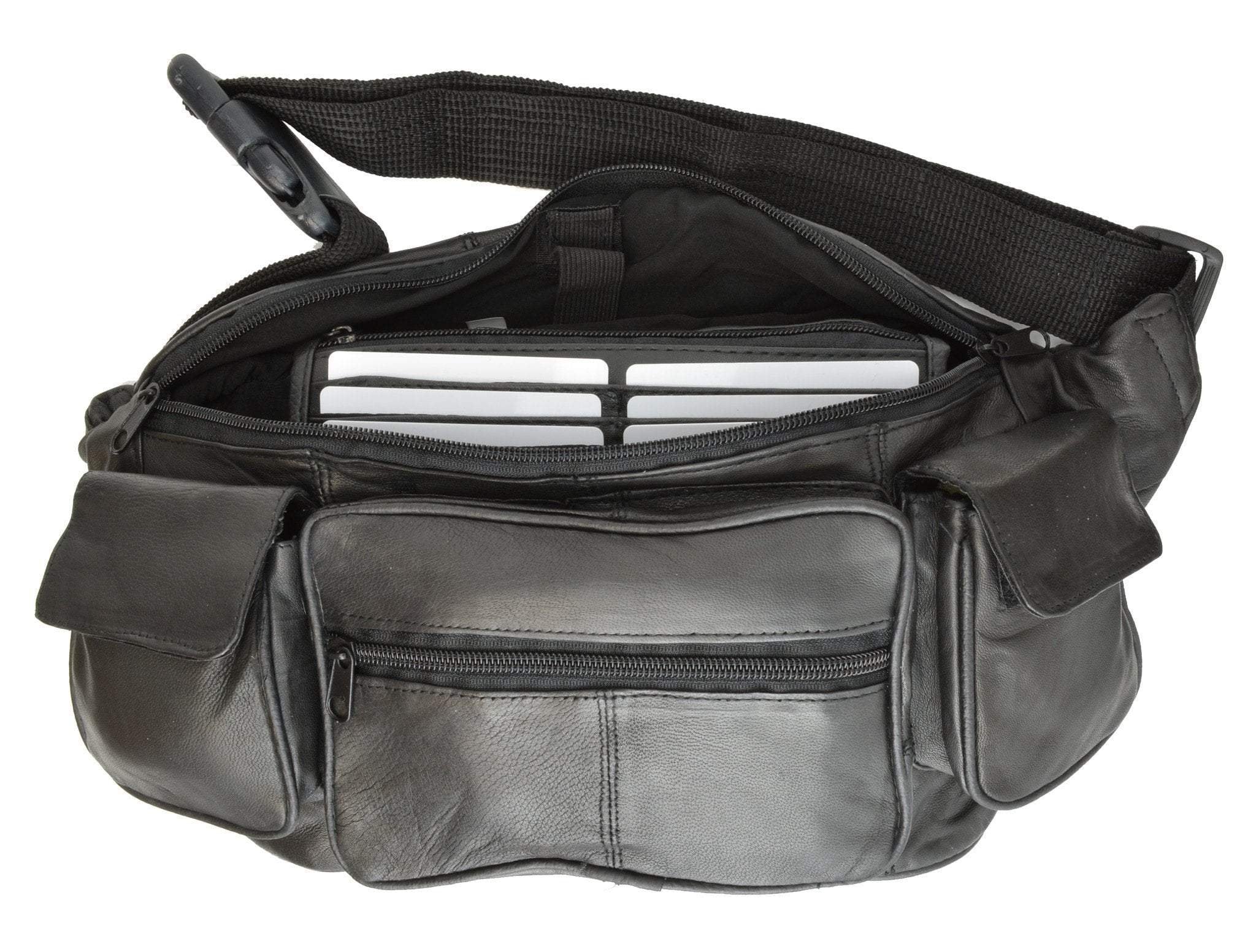 Material: Genuine LeatherSize: 11" x 7" approxOther features: Three zippered pockets Gun pouch; in the...