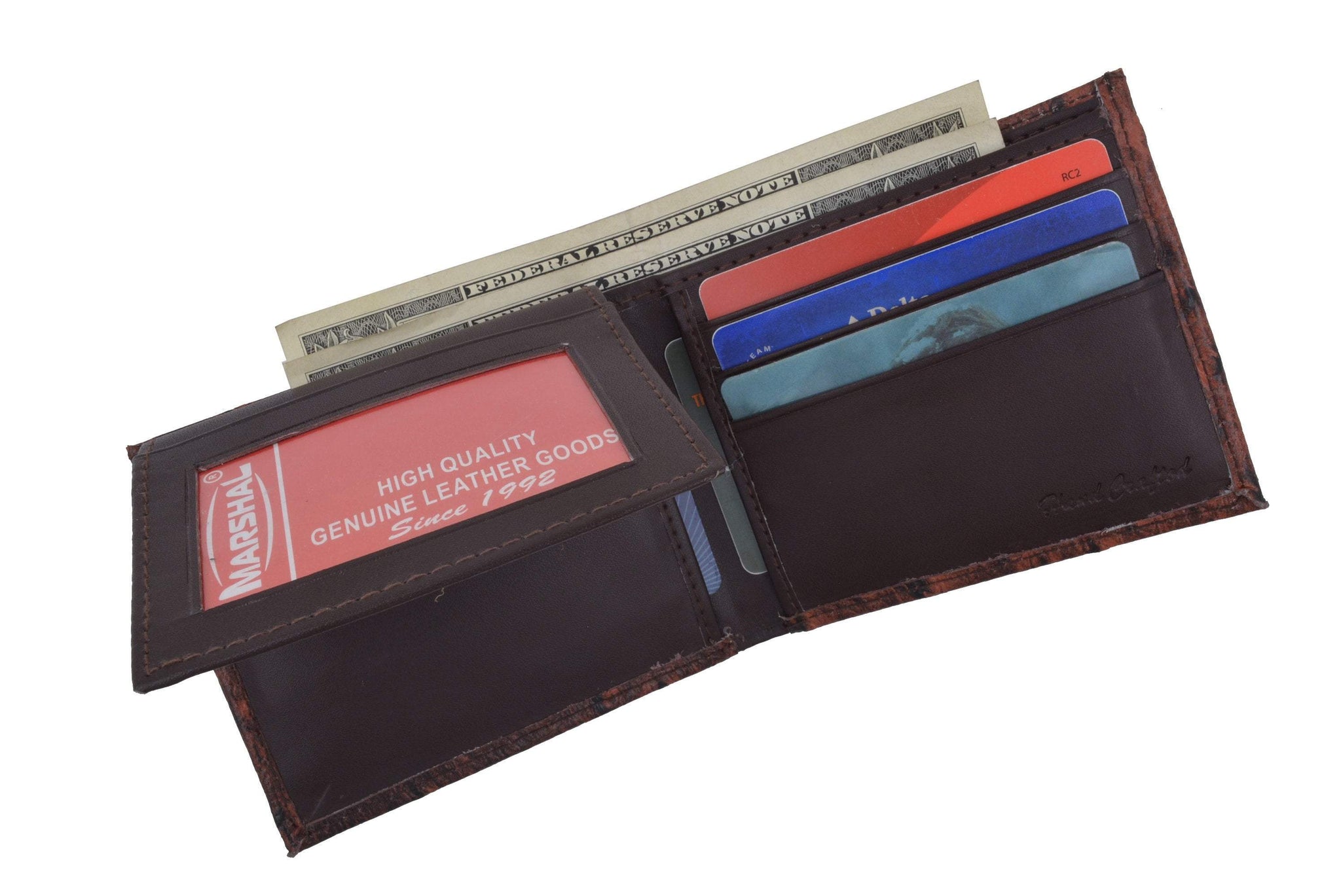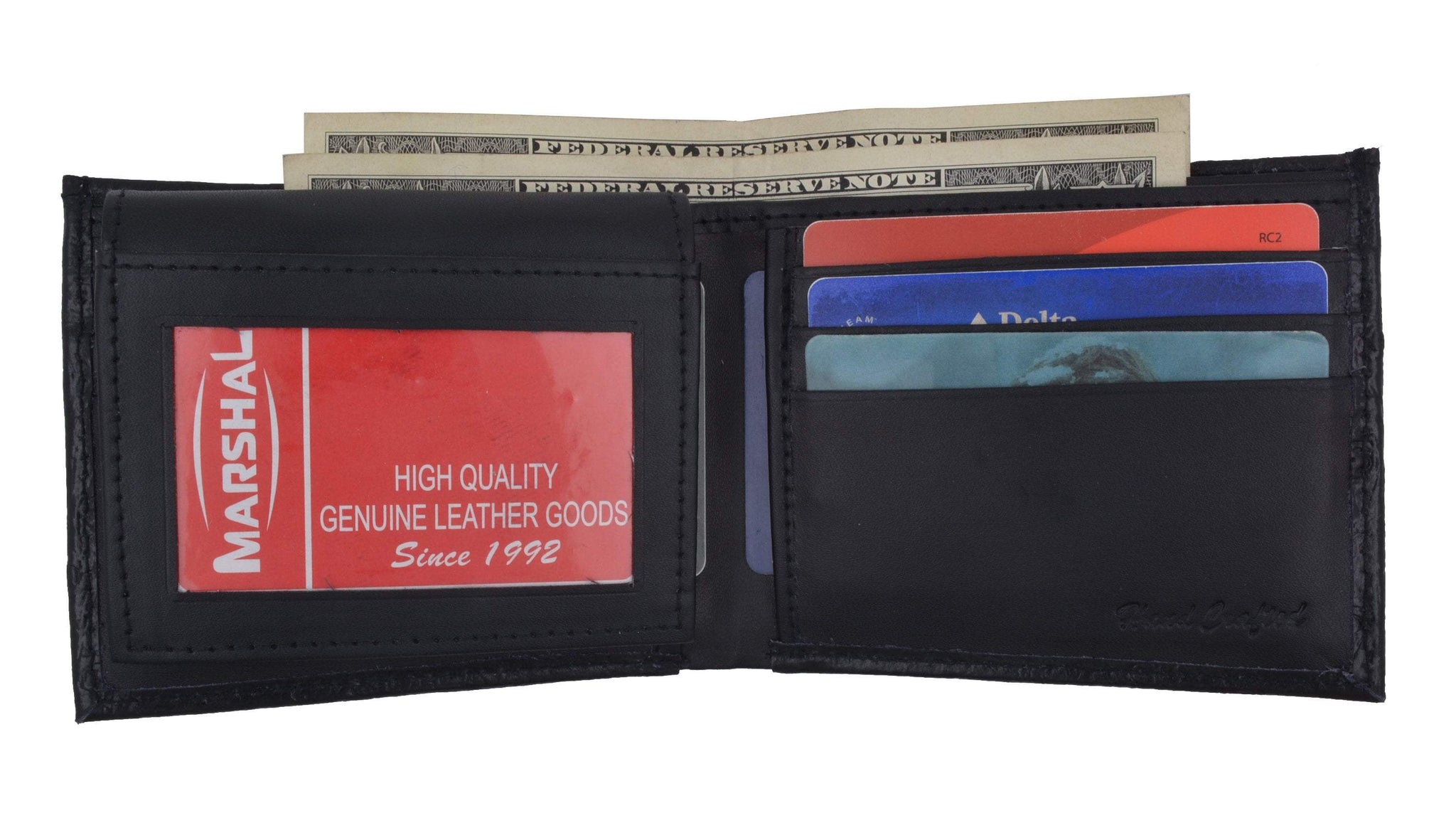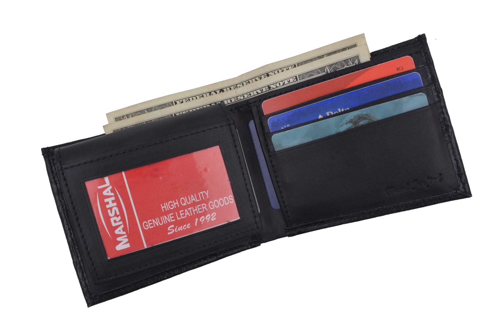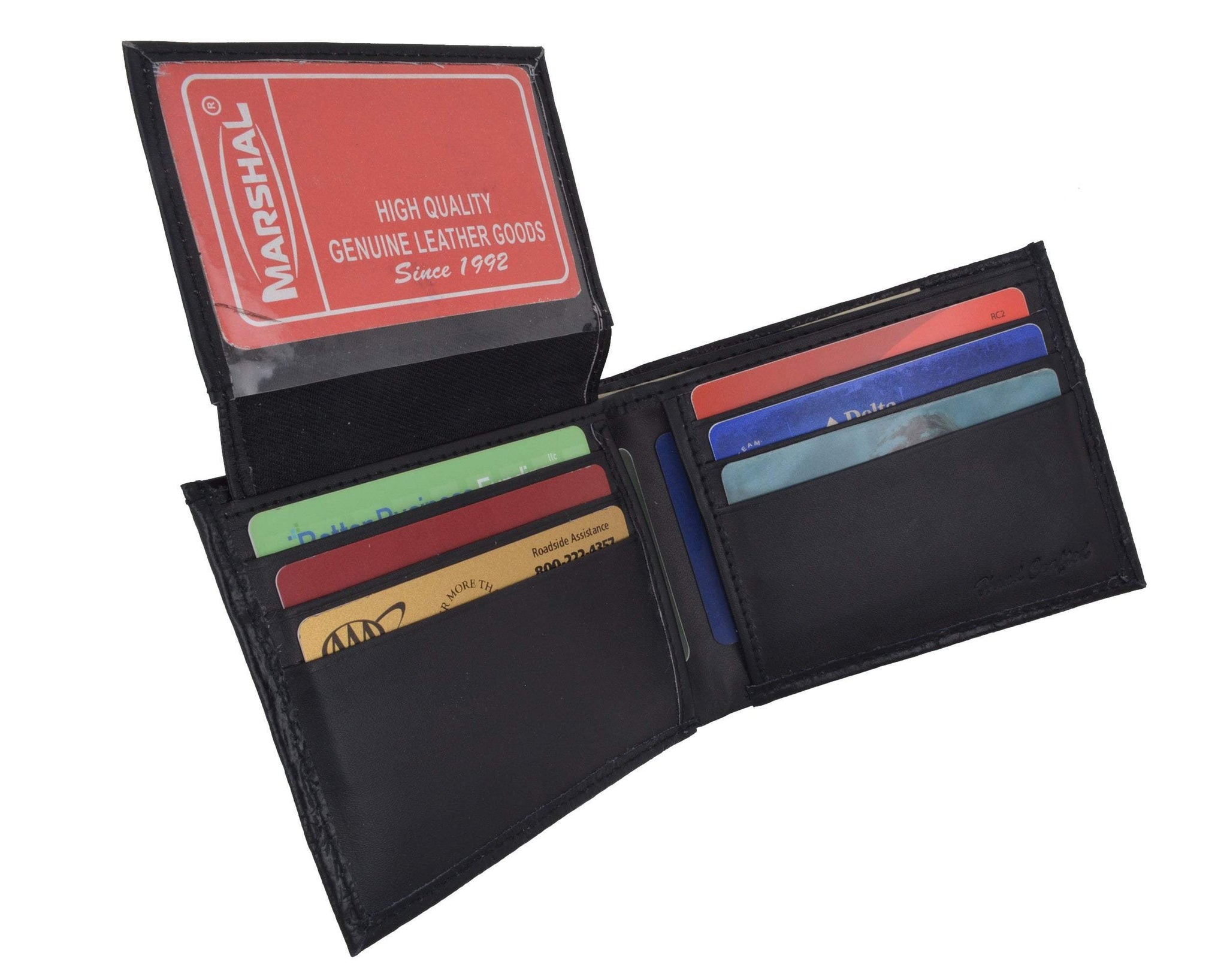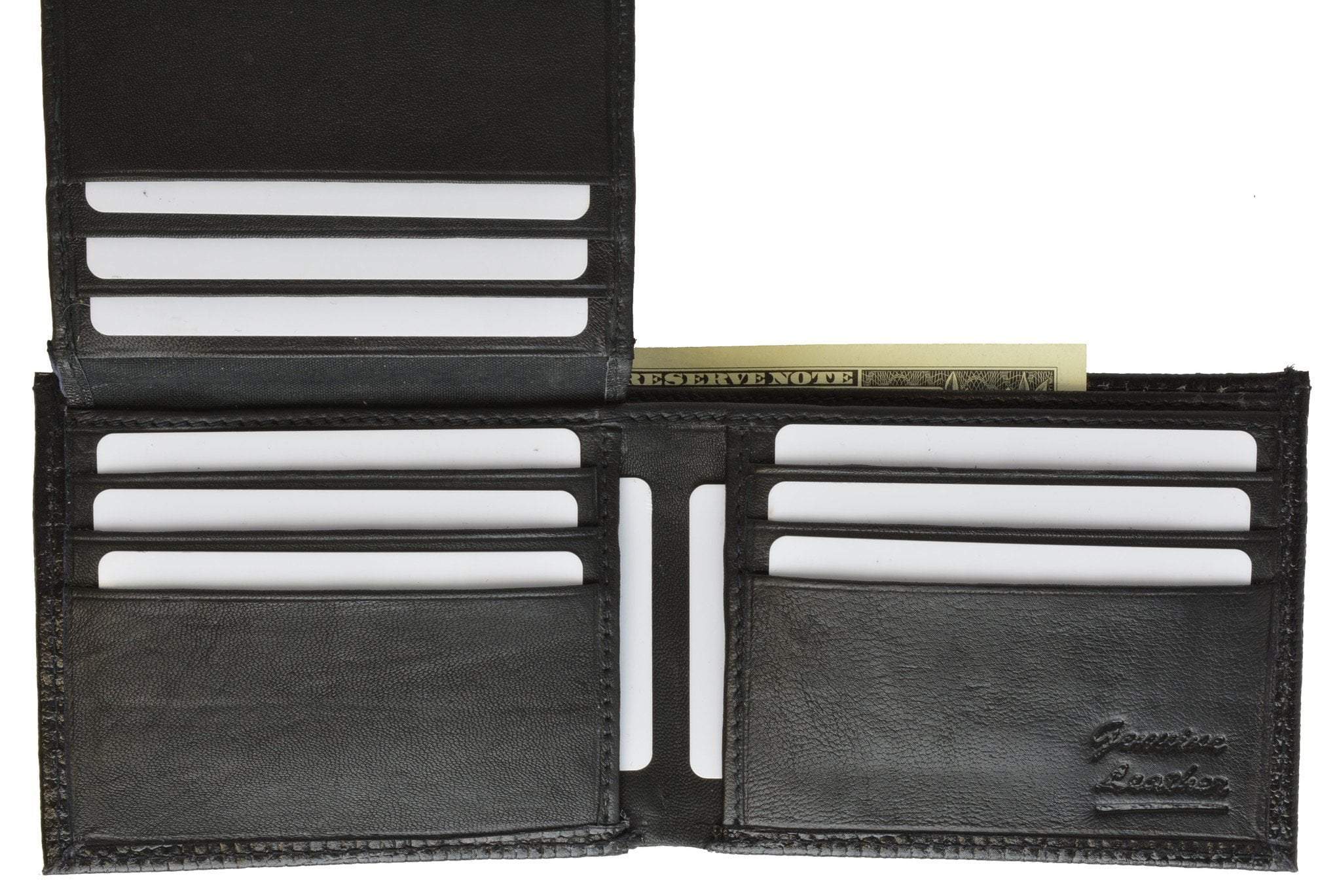Material: Genuine Leather Tri-fold Credit Card Slots: 8+ I.D. Window: Yes Currency Pocket: Divider; Hideaway...