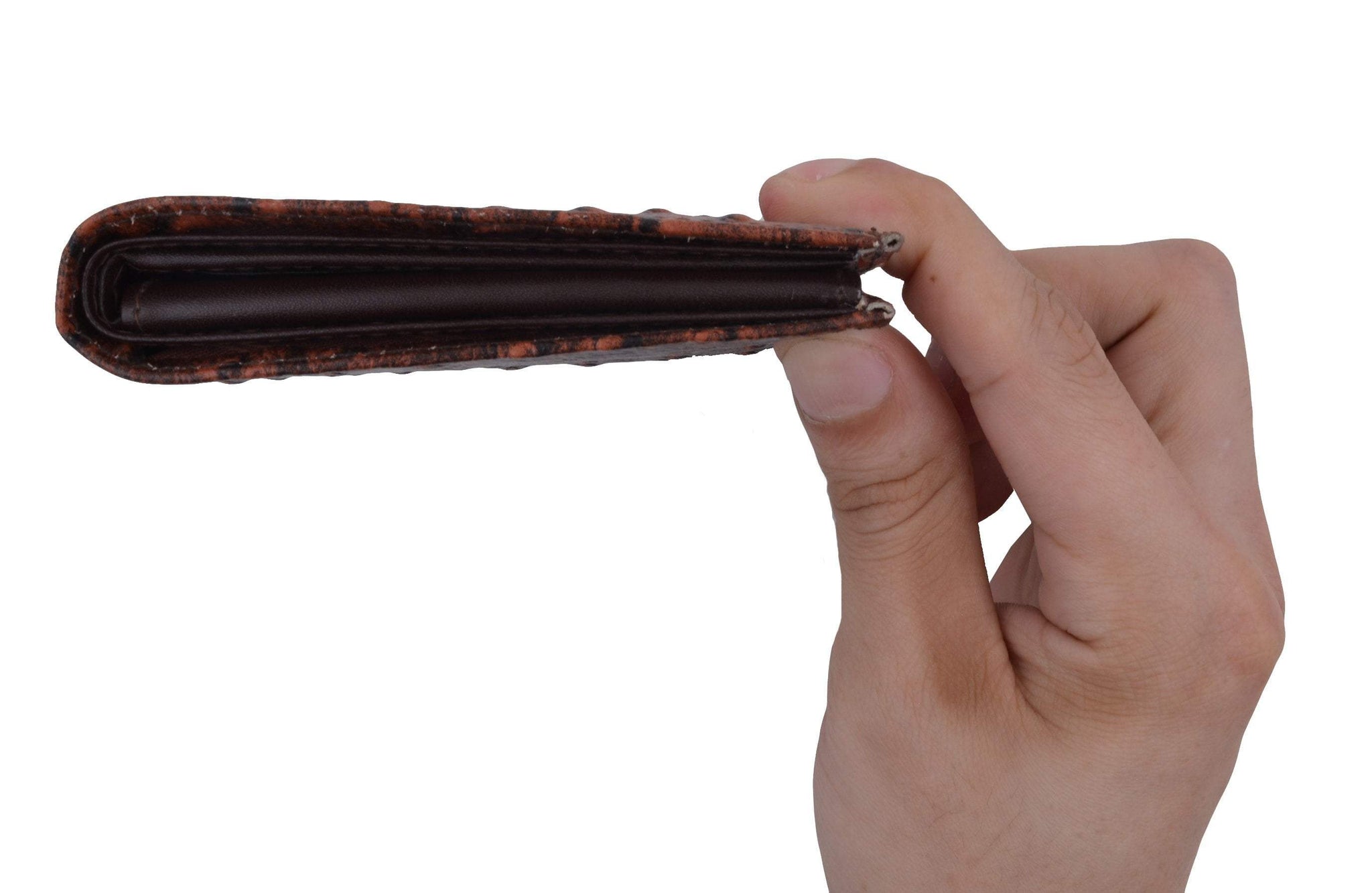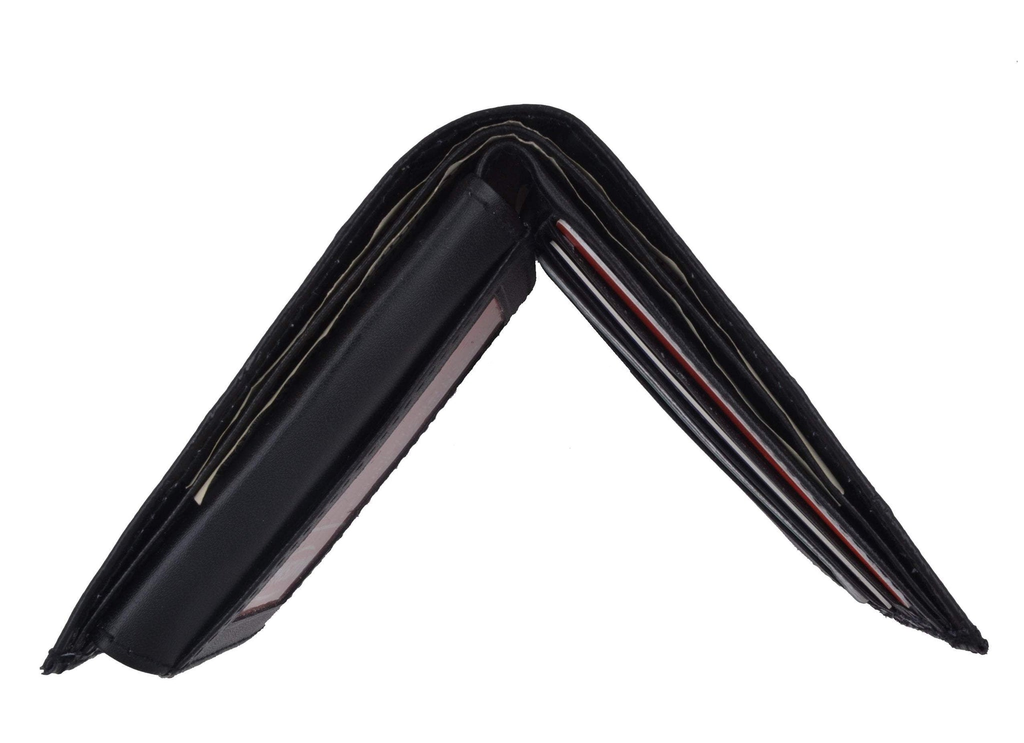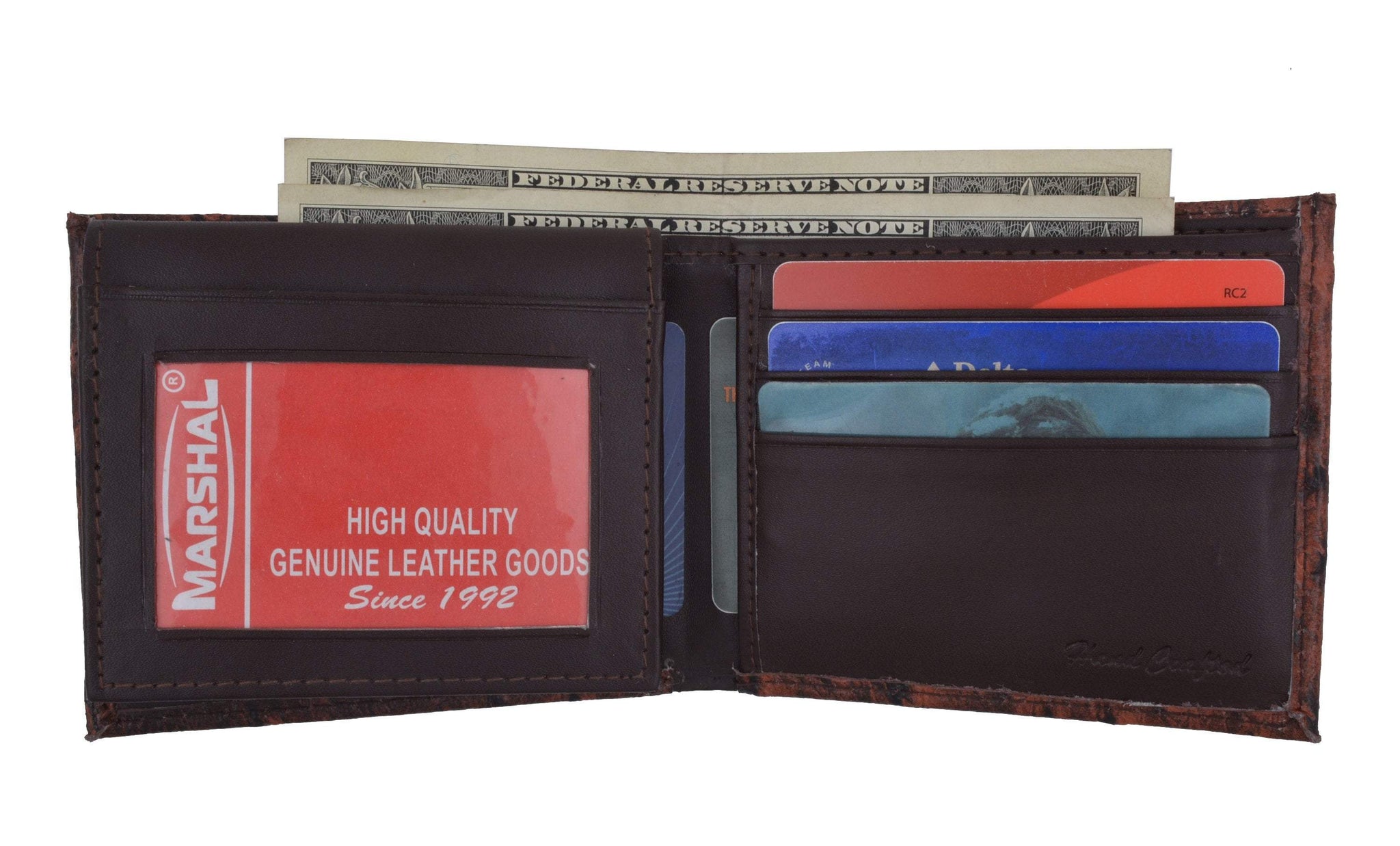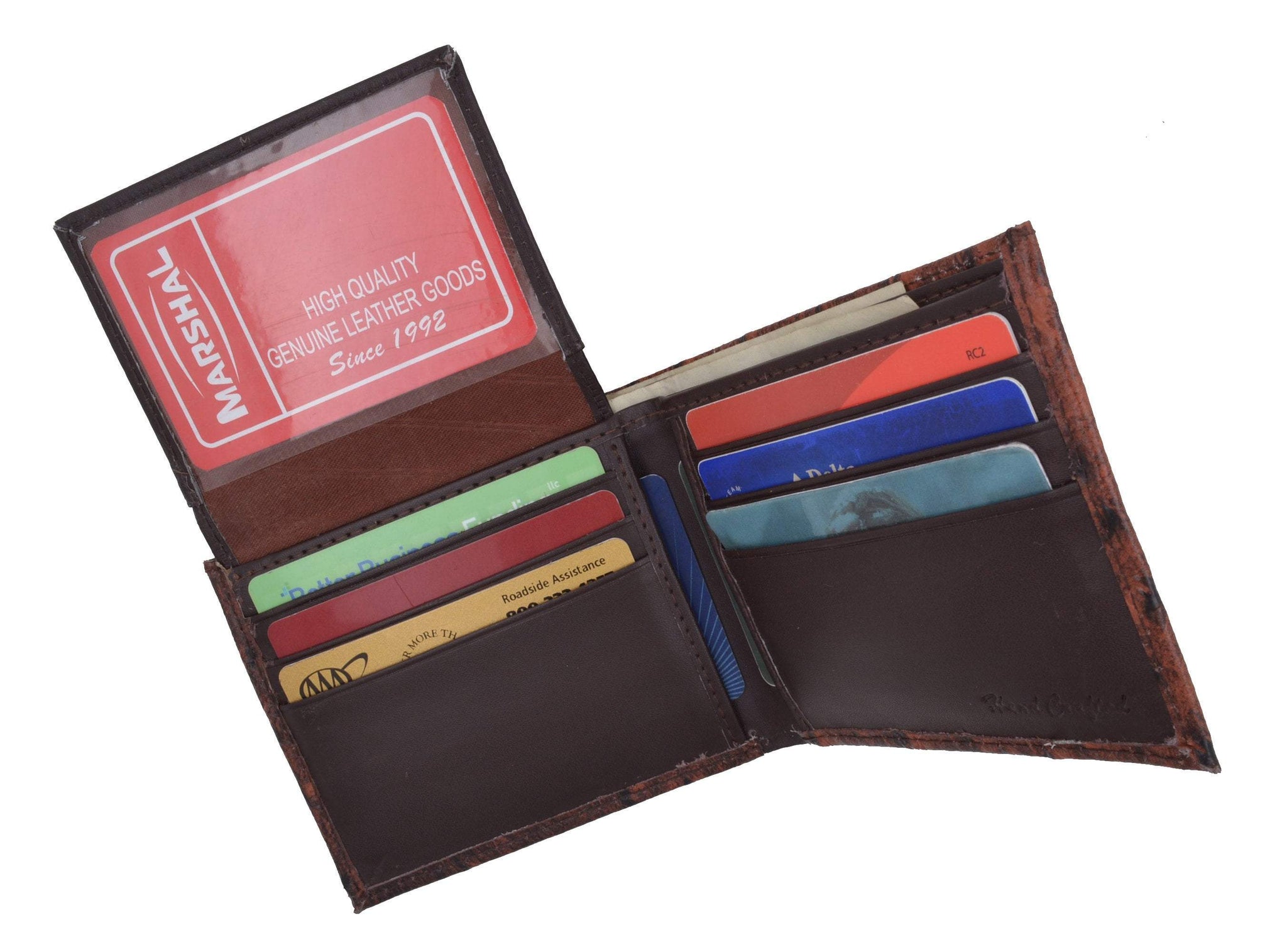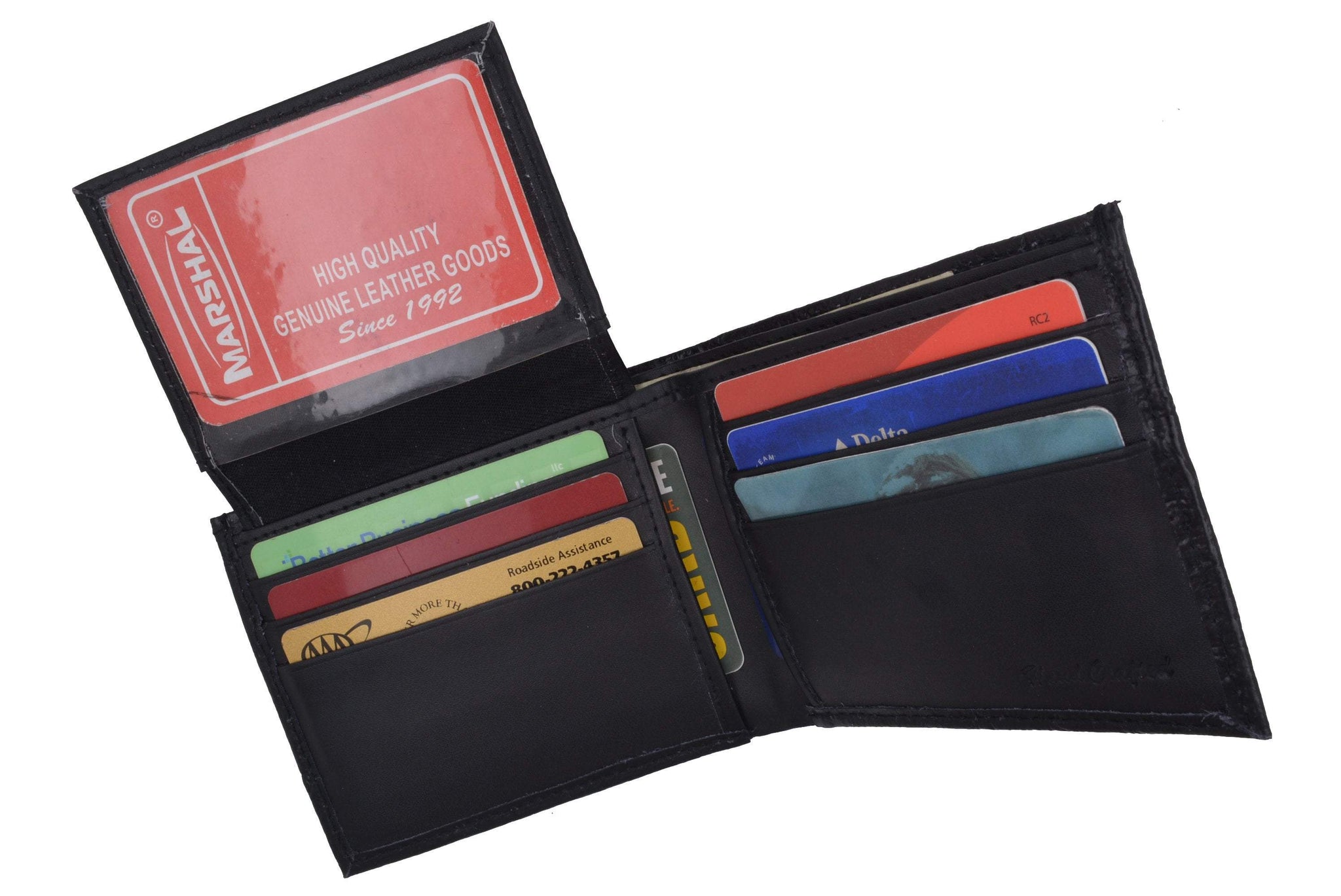 Material: Genuine Leather Tri-fold Credit Card Slots: 8+ I.D. Window: Yes Currency Pocket: Divider; Hideaway...
