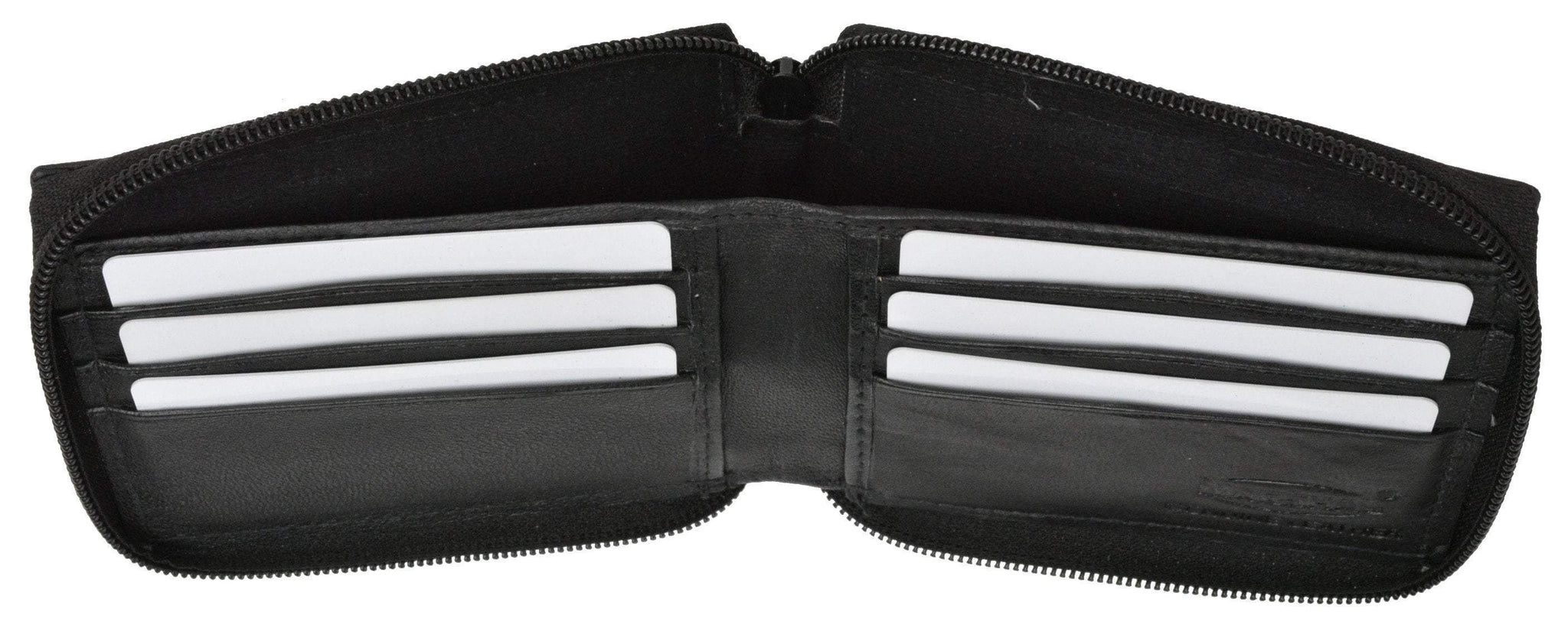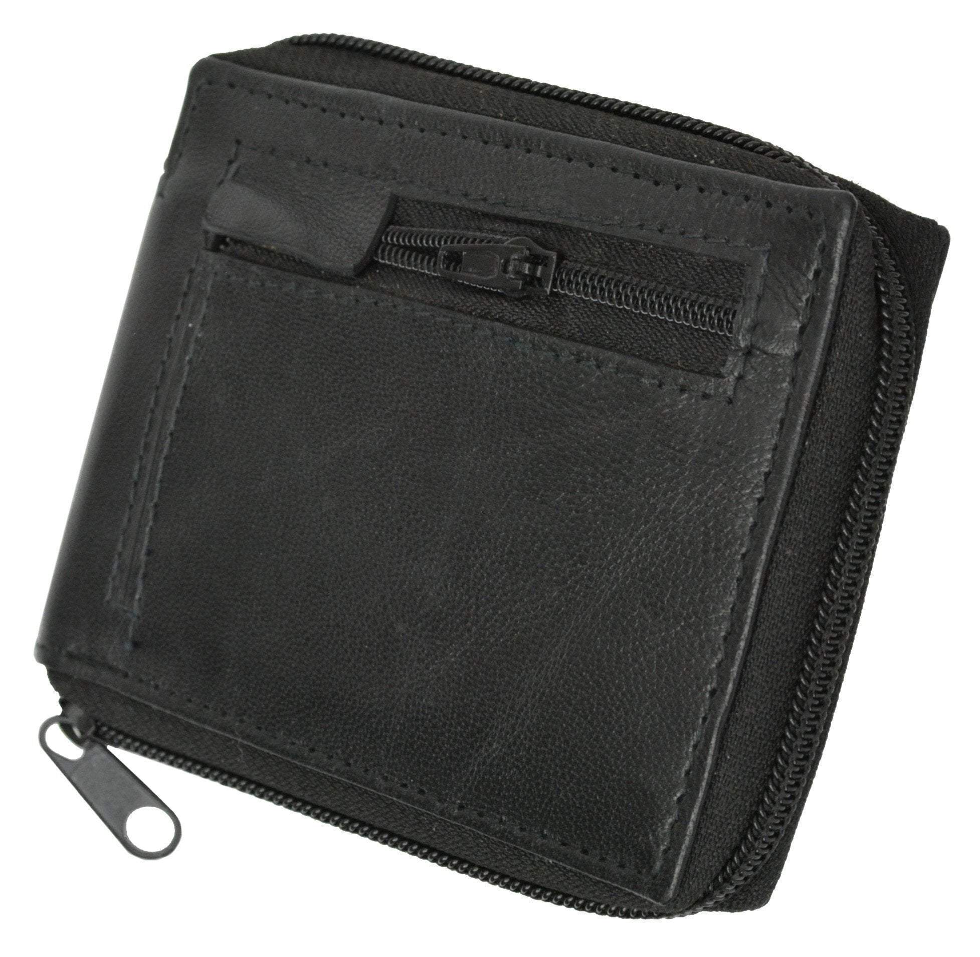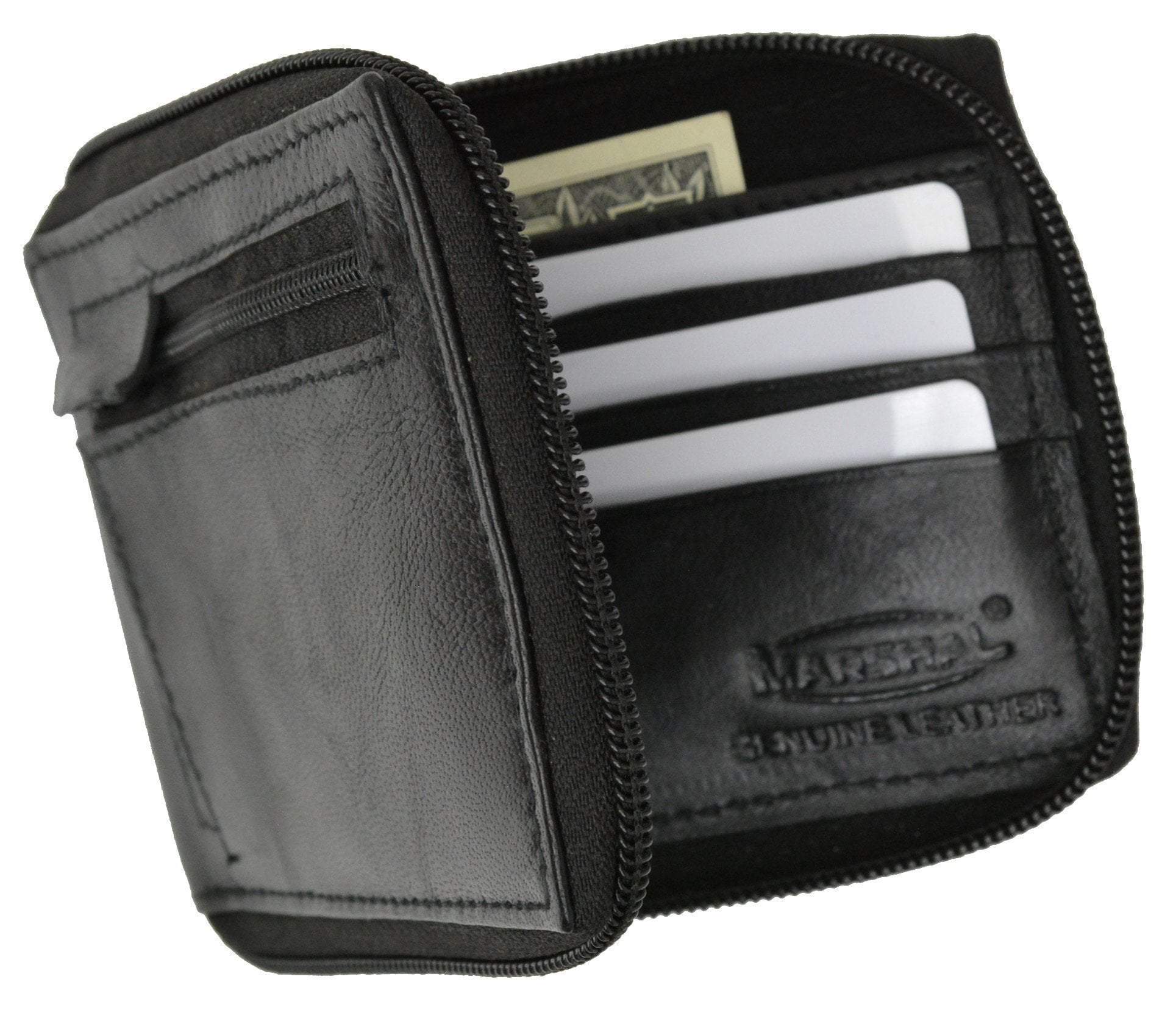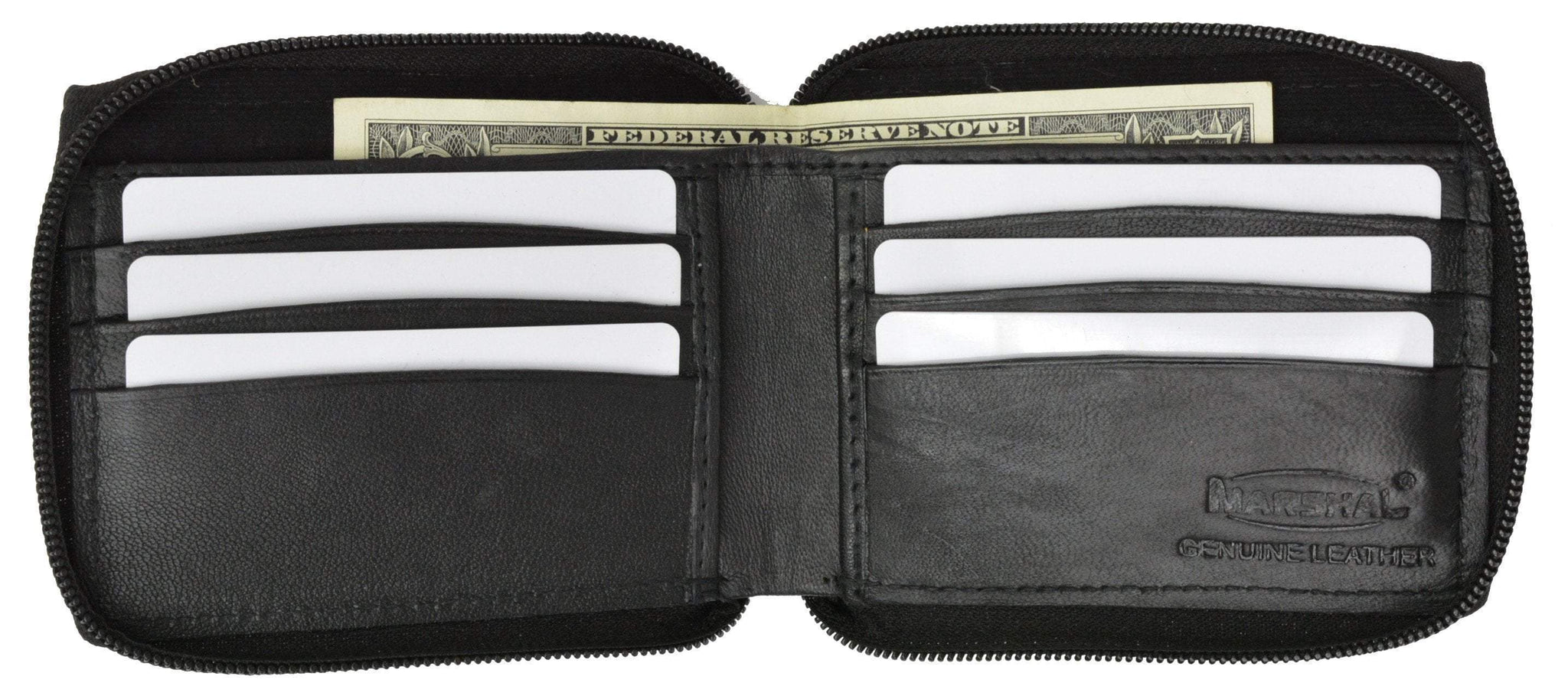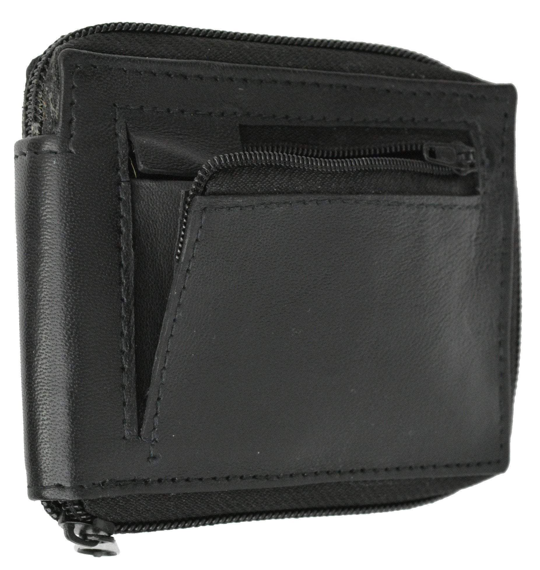 Mens Premium Genuine Leather Bifold Zip-Around Wallet8+ Credit Card SlotsLarge Bill CompartmentOutside Zipper PocketMeasurements: 4.6" L X 3.5" H approx when closed