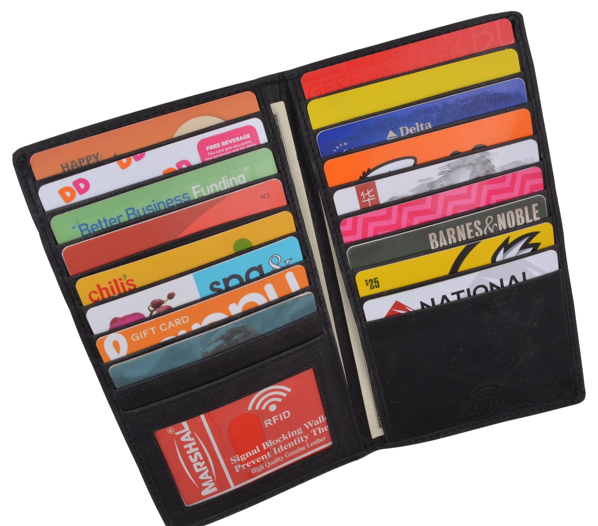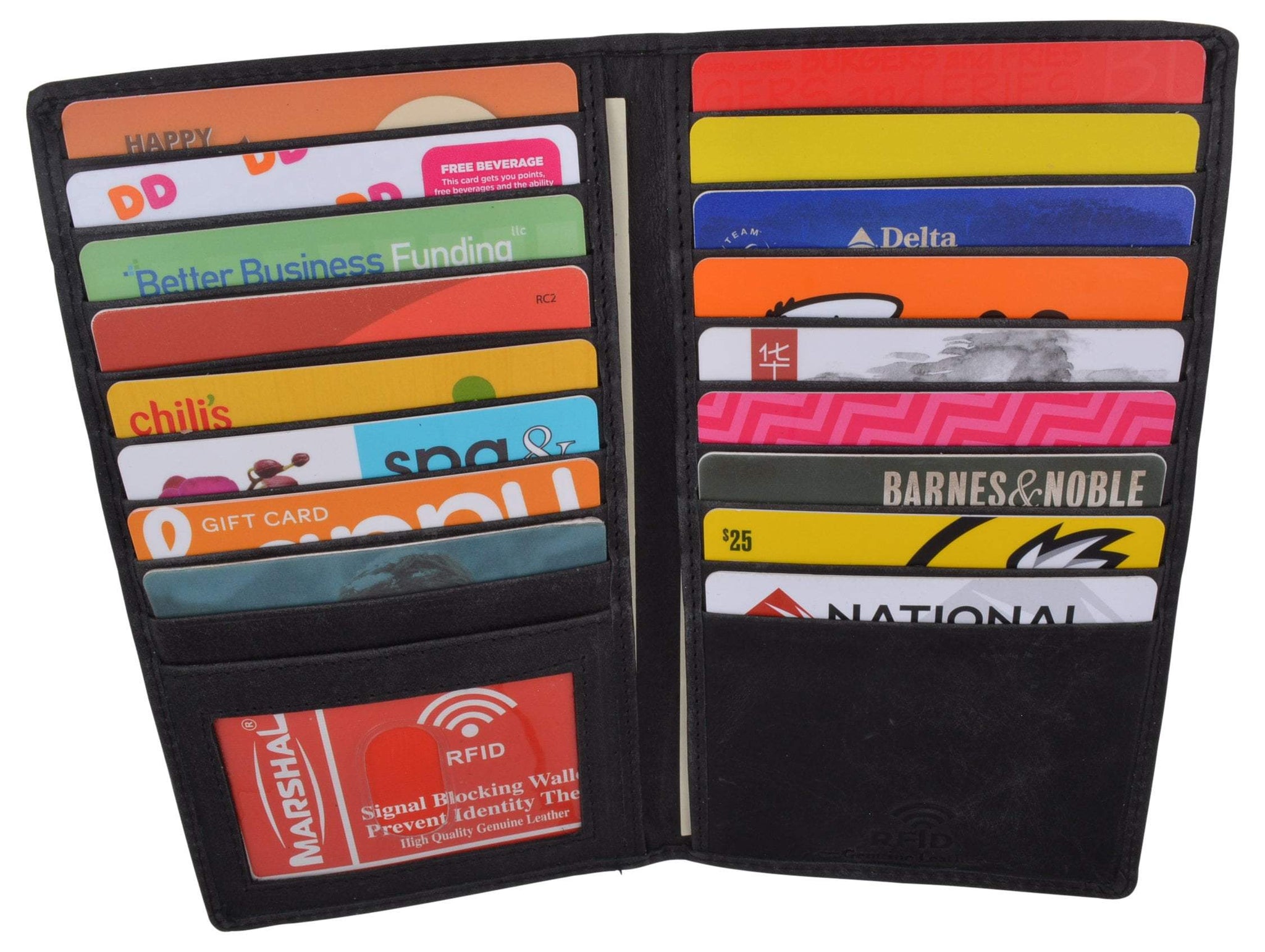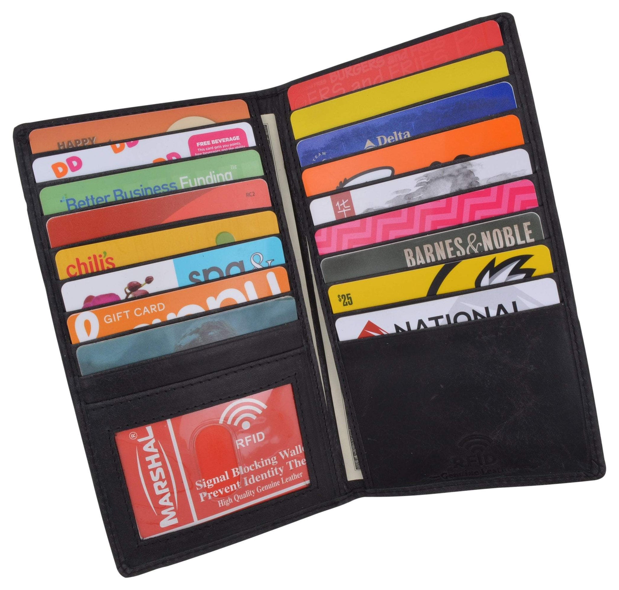• MORE SLOTS MORE CONVENIENCE: Hold one of our Marshal wallets in your hands today, open it and discover its many slots and compartments. 19 slots for your credit or debit cards, your shopping cards, or gift shopping cards. 2 large bill compartments that will carry your money safely and 1 ID window. Place your ID or driver’s license
