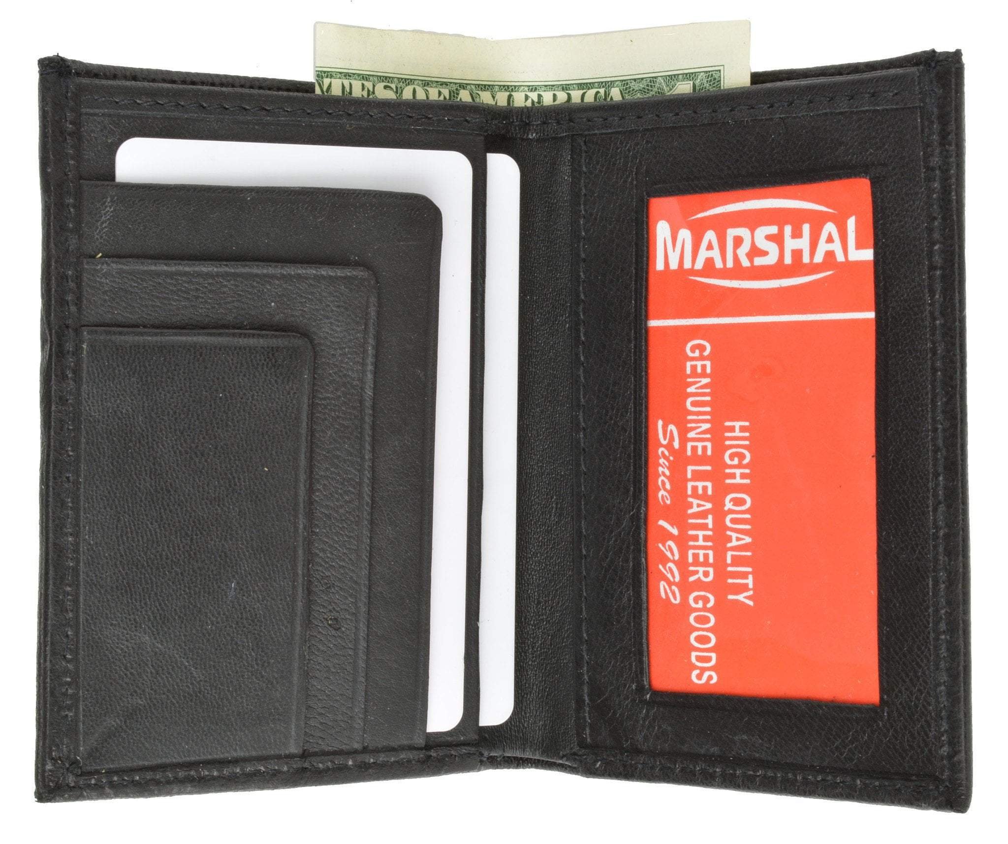 Material: Genuine Leather Bi-foldSize: 4" X 3" (Folded) approxCredit Card Slots: 8+I.D. Window: Yes (External...