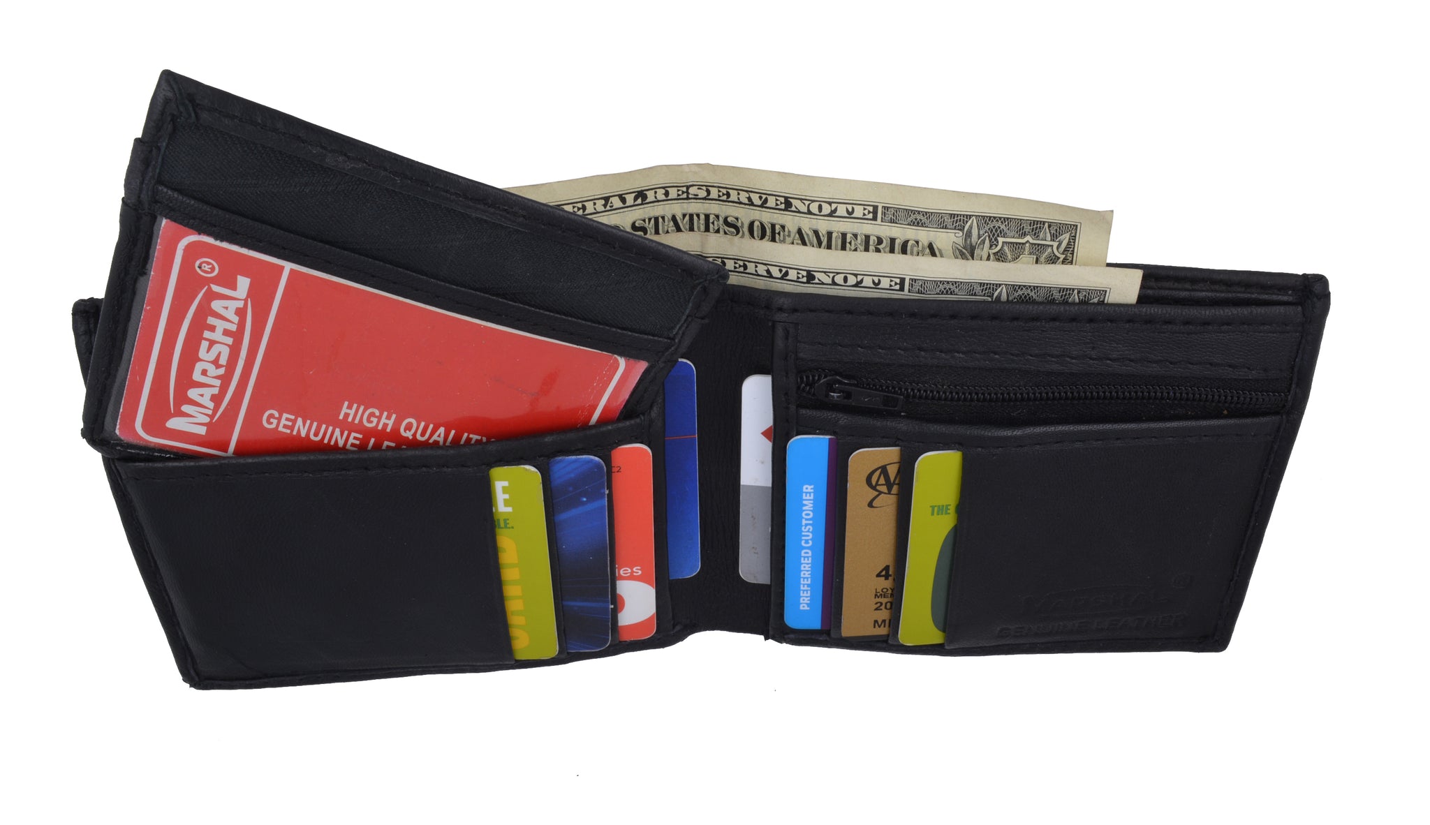 Material: Genuine Leather Tri-fold Credit Card Slots: 8+ I.D. Window: Yes Currency Pocket: Divider; Hideaway...