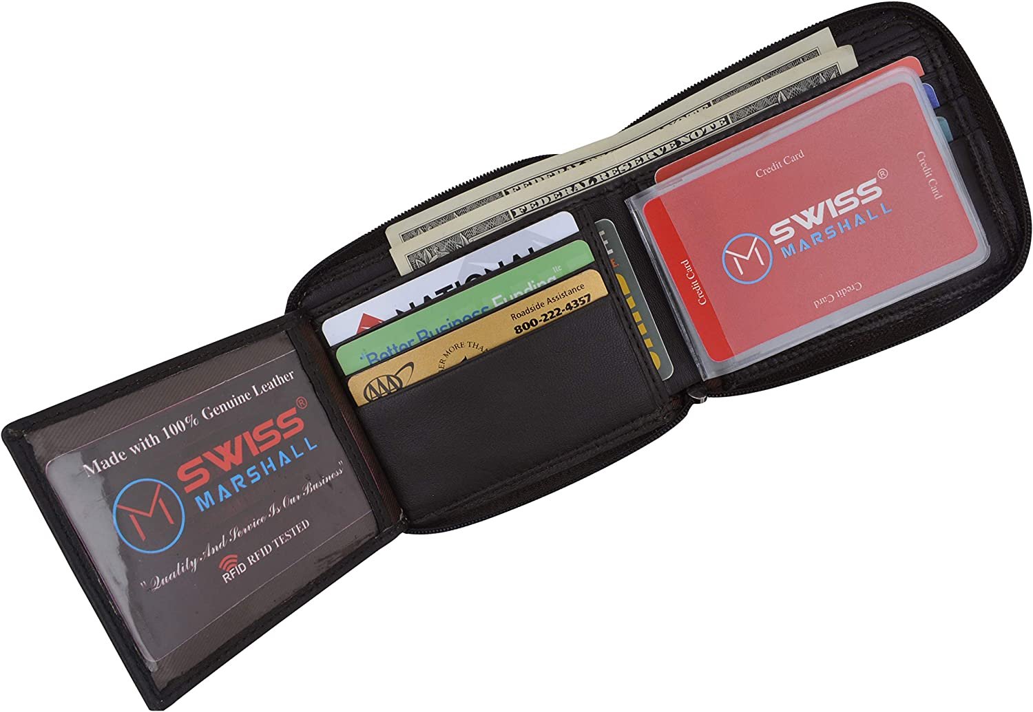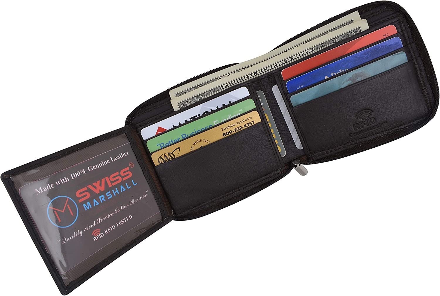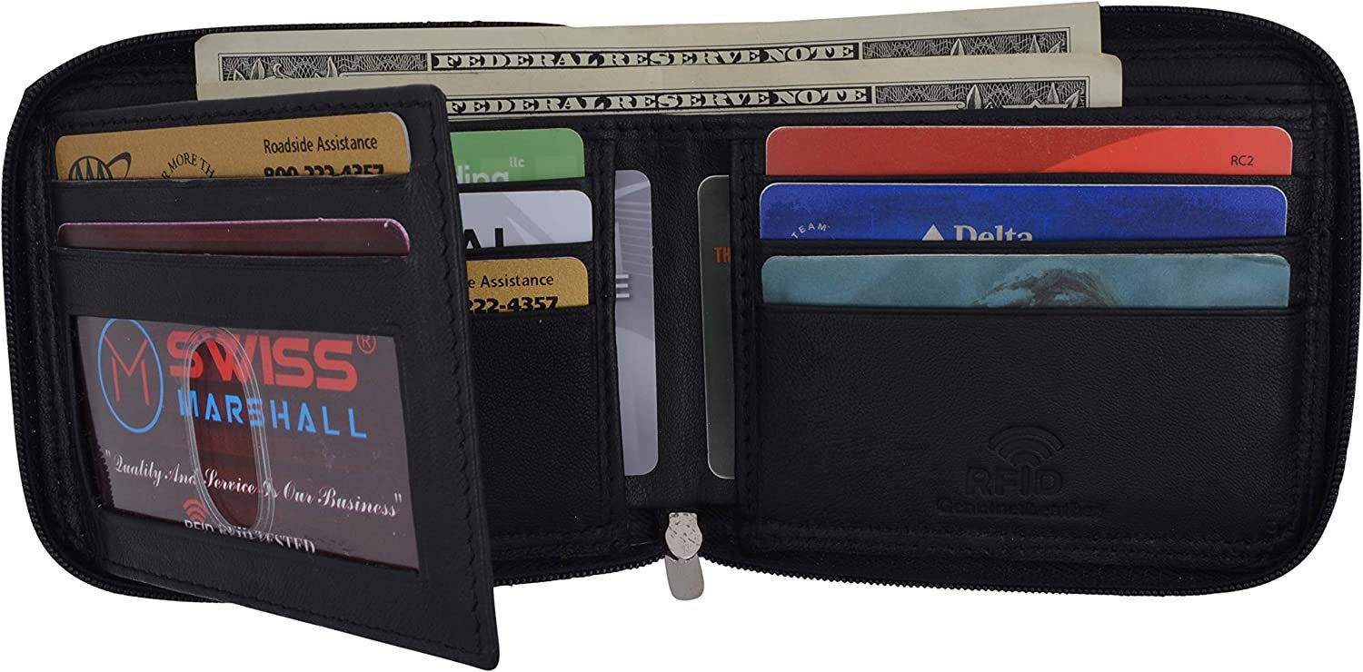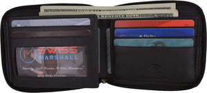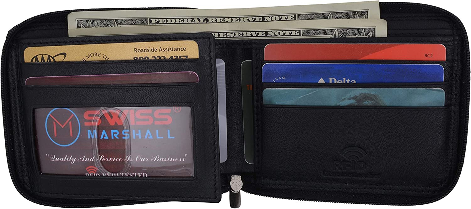 Swiss Marshall Men's Zipper RFID Blocking Premium Leather Zip-Around ID Bifold Wallet (Brown)