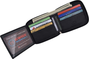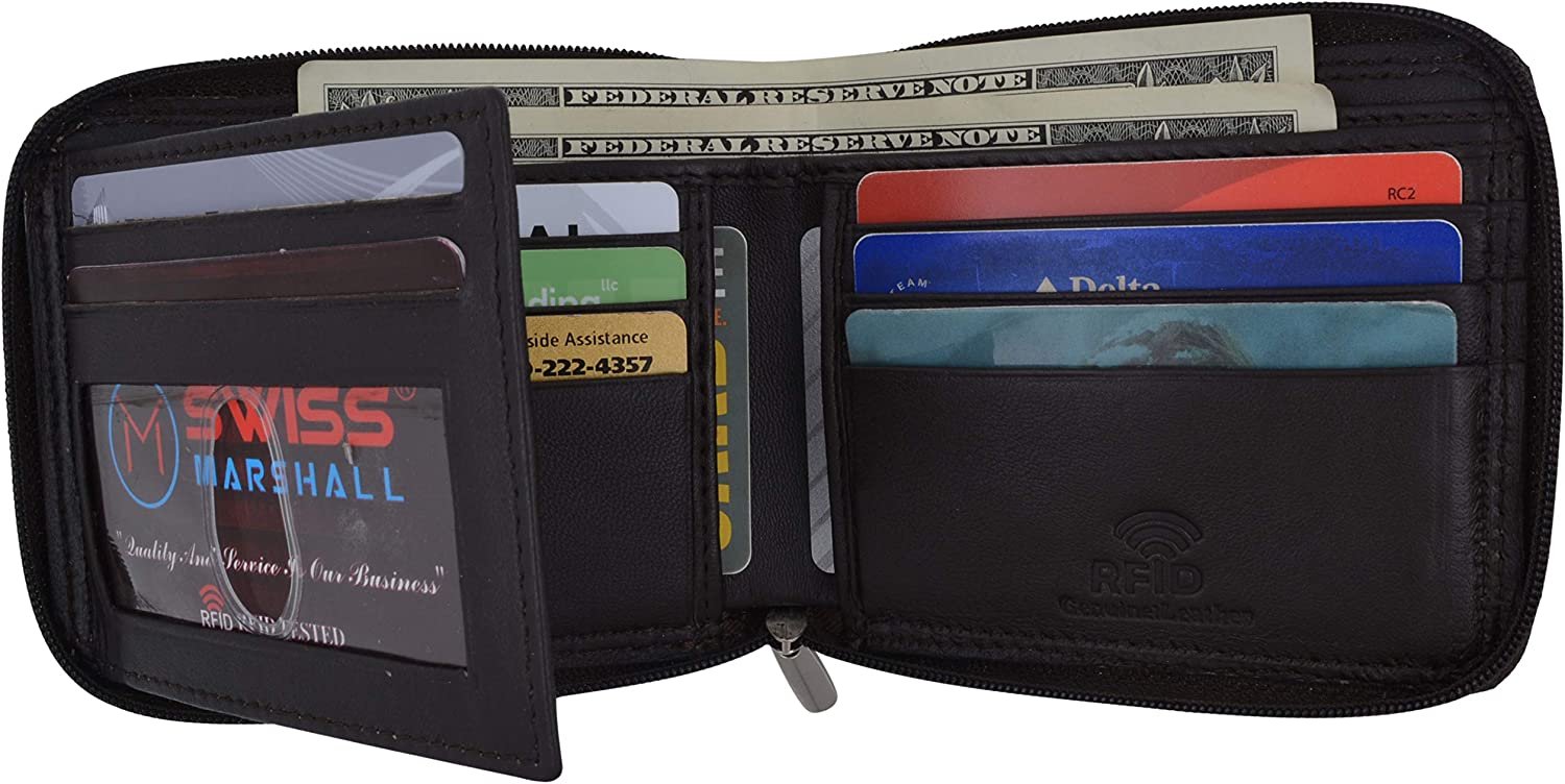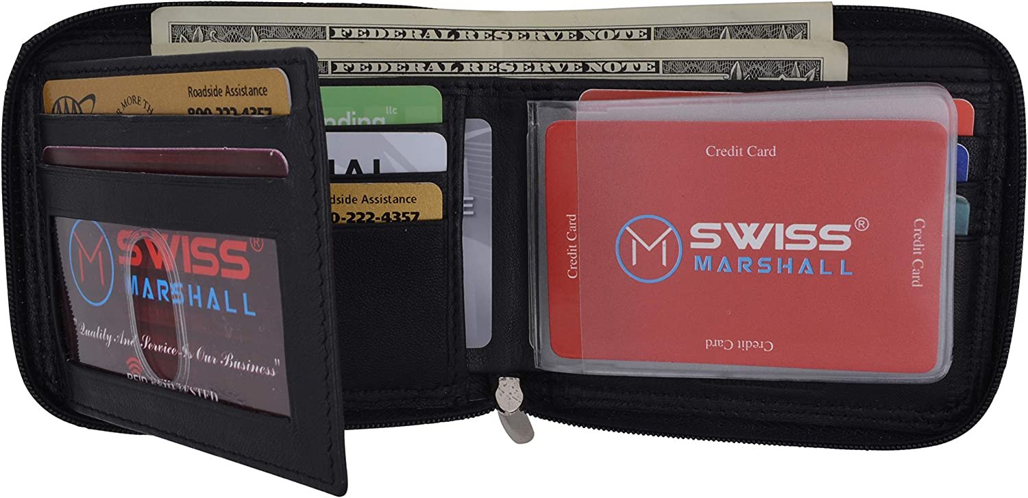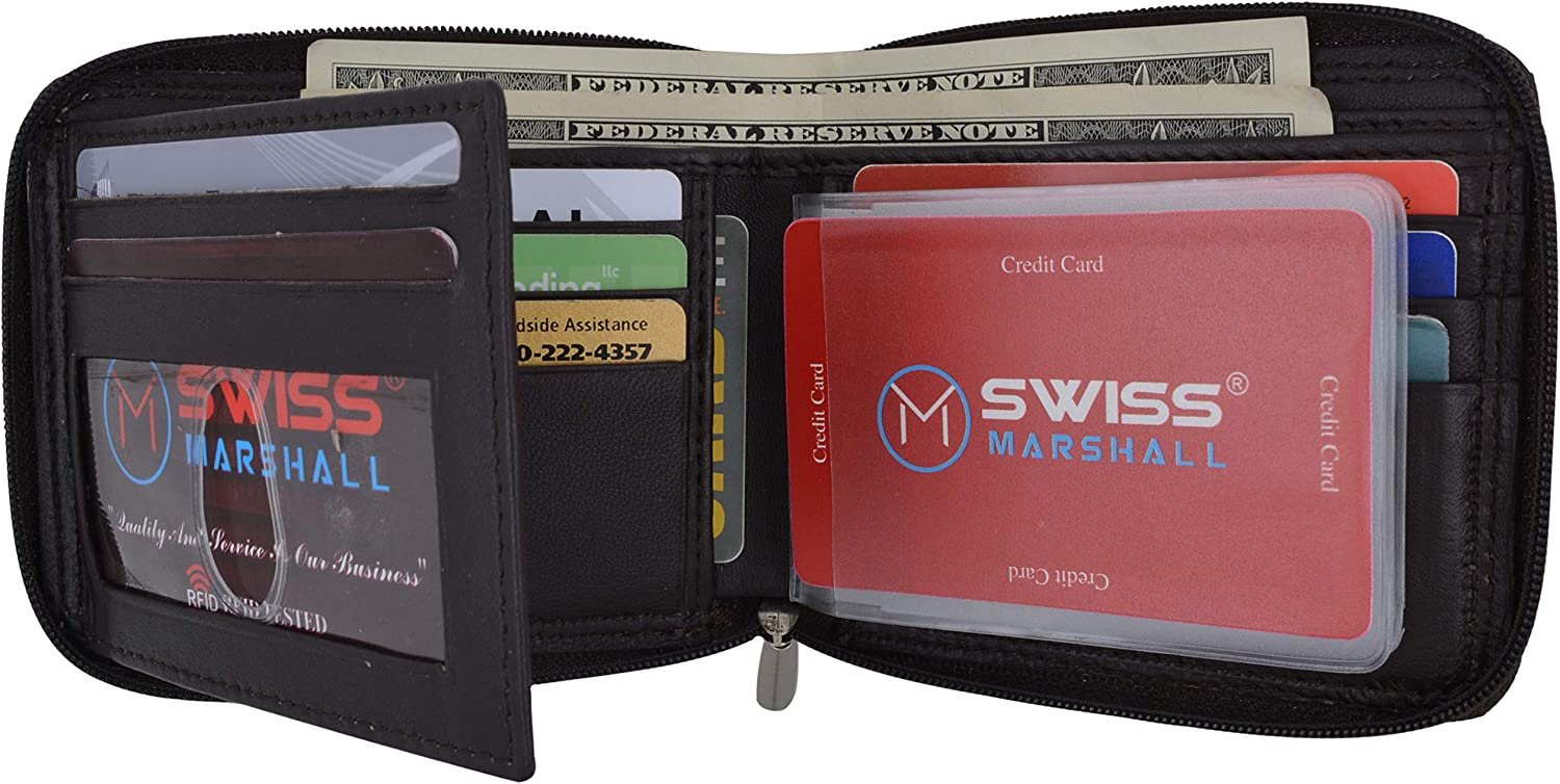 Swiss Marshall Men's Zipper RFID Blocking Premium Leather Zip-Around ID Bifold Wallet (Brown)