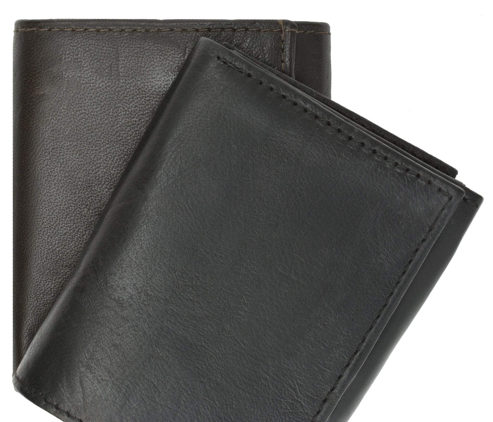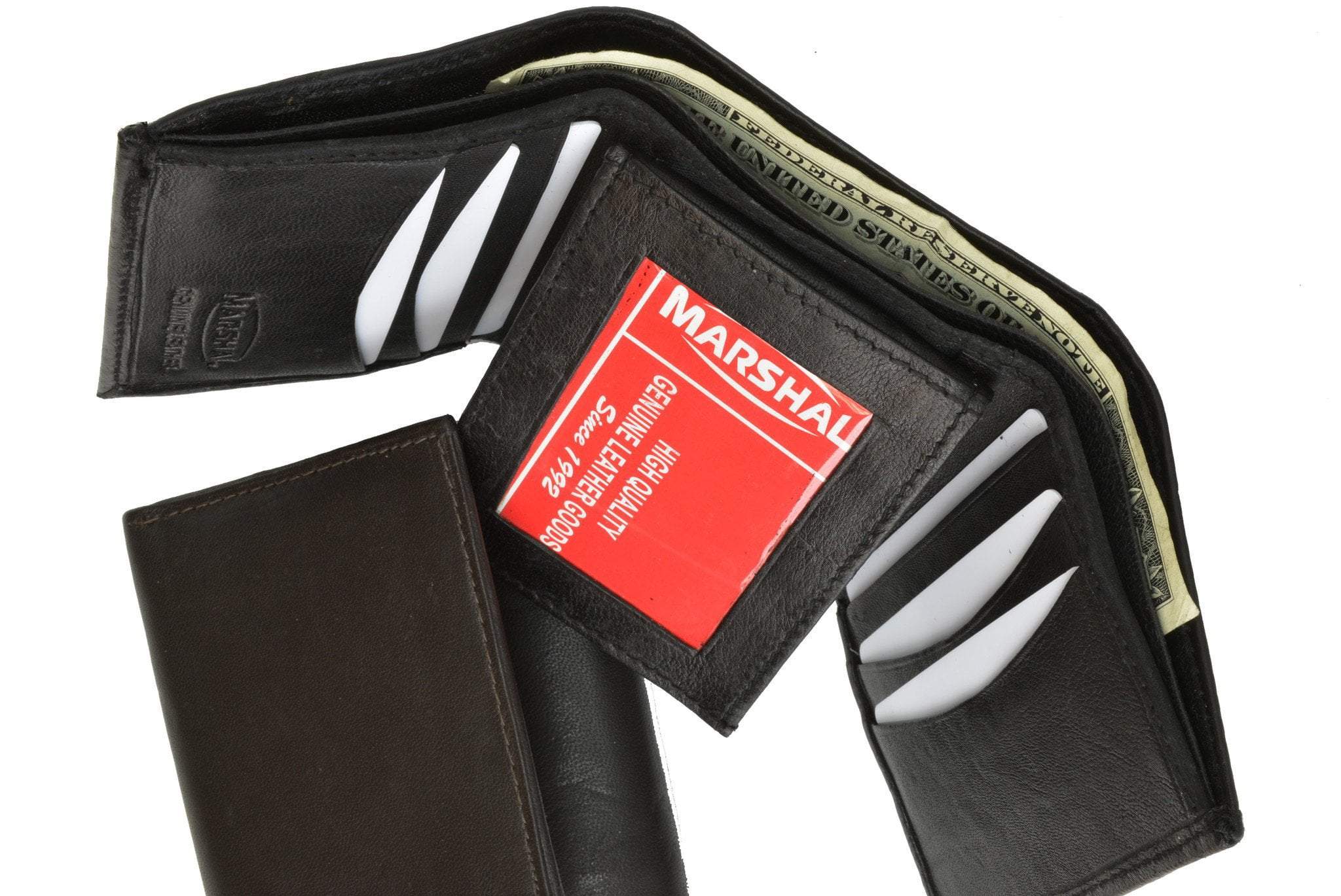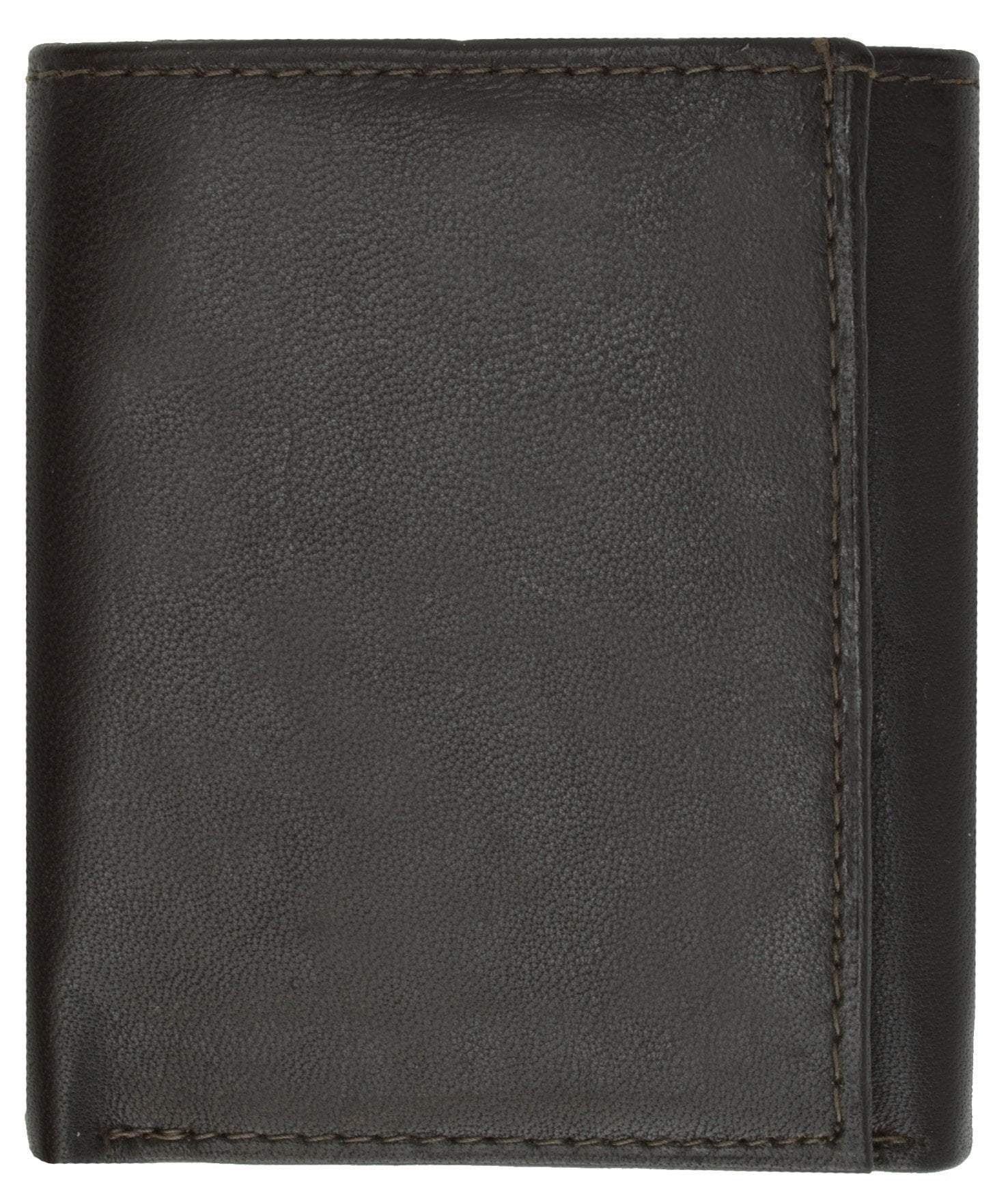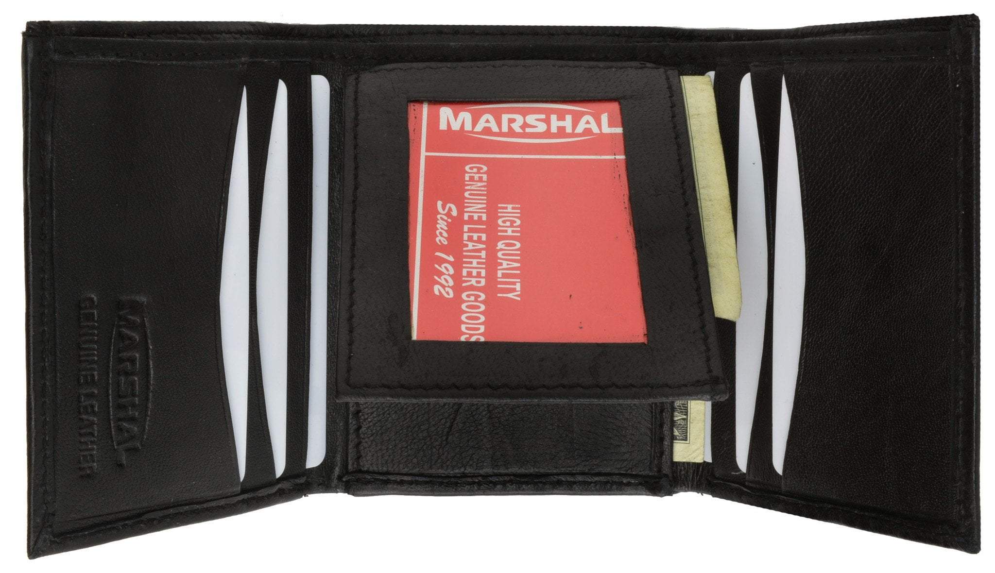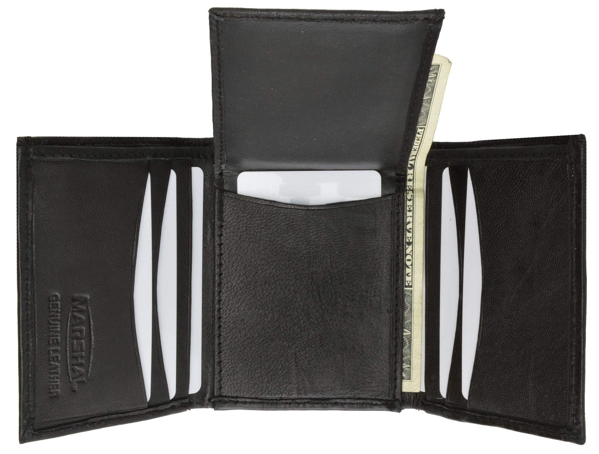 Material: Genuine Leather Tri-fold Credit Card Slots: 8+ I.D. Window: Yes Currency Pocket: Divider; Hideaway...
